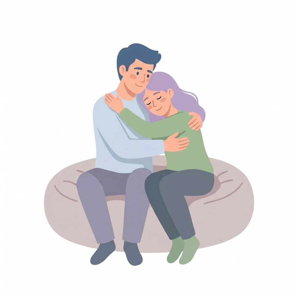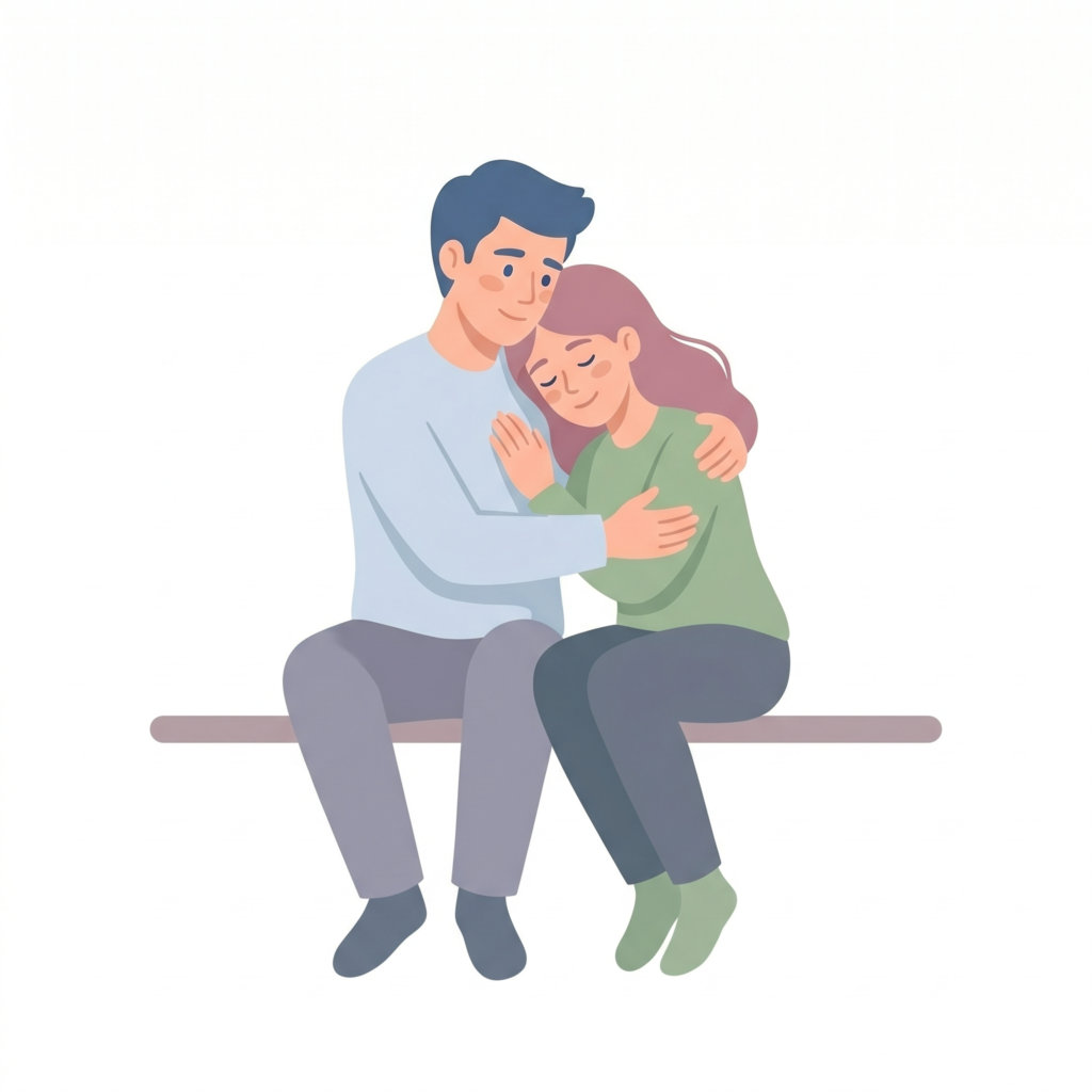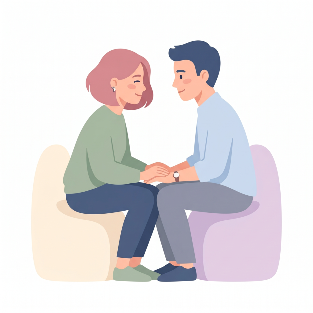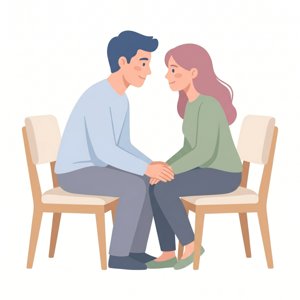 Both partners sit facing each other closely, maintaining eye contact and gentle touch.