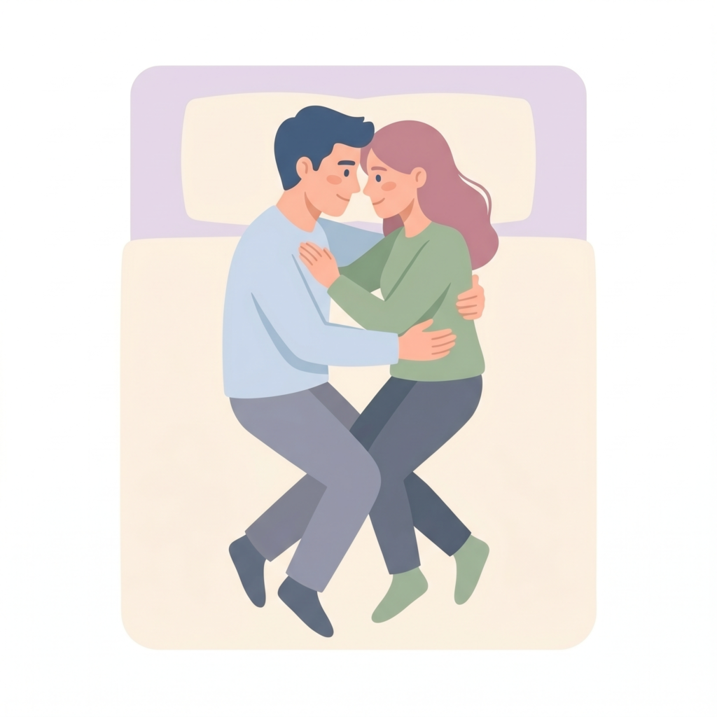 Both partners lie next to each other, facing the same direction, staying close and relaxed.