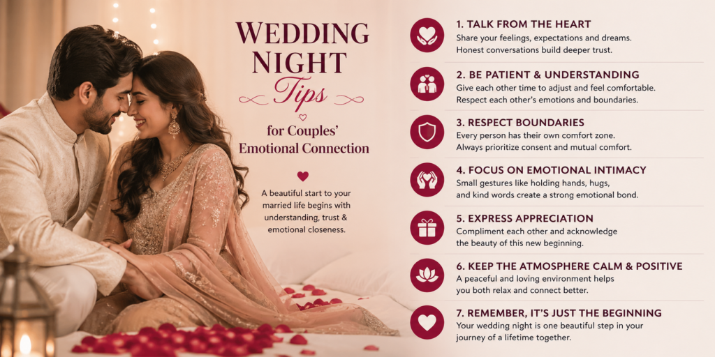The wedding night is not about perfection. It is about starting a new journey together with understanding and care. These wedding night tips for couples help you focus on what truly matters, which is comfort, trust, and emotional bonding.